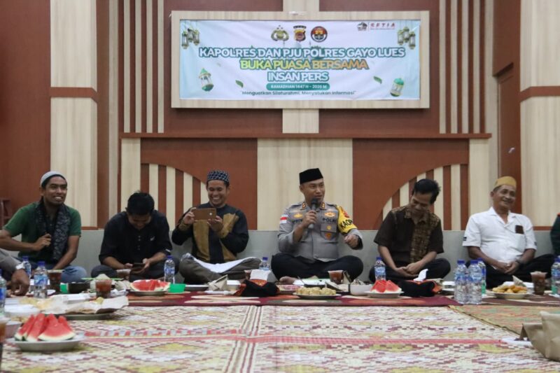 GAYO LUES | Dalam suasana penuh kehangatan bulan suci Ramadhan, Kepolisian Resor Gayo Lues menggelar kegiatan buka puasa bersama dengan insan pers sebagai upaya mempererat hubungan kemitraan serta memperkuat sinergitas antara kepolisian dan media. Kegiatan ini berlangsung pada Senin, 16 Maret 2026, mulai pukul 18.00 WIB di Aula Adhi Pradana Polres Gayo Lues, Jalan Pang Abu Blangsere, Kecamatan Kutapanjang, Kabupaten Gayo Lues.