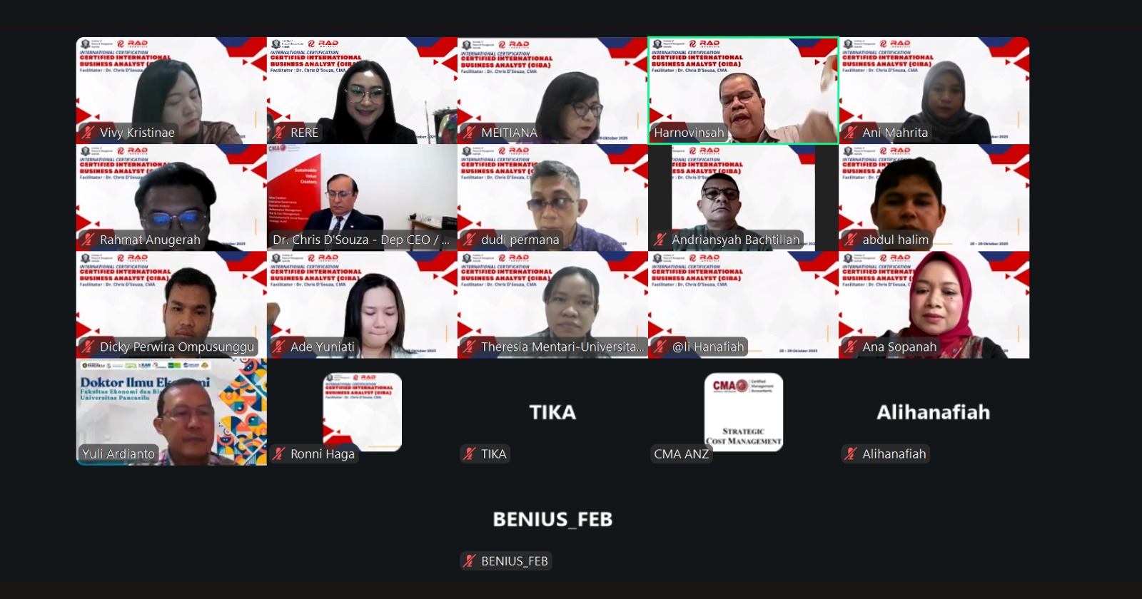Sebanyak 10 dosen dan pejabat struktural FEB UPR tercatat mengikuti sertifikasi CIBA, di antaranya Wakil Dekan Bidang Akademik Dr. Meitiana, MM; Ketua Jurusan Manajemen Dr. Vivy Kristinae, M.Si; Sekretaris Jurusan Manajemen Ani Mahrita, M.Sc; Sekretaris Jurusan Akuntansi Theresia Mentari, MSA; Sekretaris Jurusan Ekonomi Pembangunan Dicky Perwira Ompusunggu, M.Si. Beberapa dosen lain termasuk Kaprodi MIE Drs. Benius Ph.D; serta Dr. Roni Haga, M.Si; Ade Yuniati, M.Sc; Rahmat Anugrah, M.Acc; dan Abdul Halim, M.E.